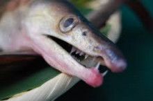 ハモは水槽から獲ろうとすると噛みつきます。こんな感じの歯で。。