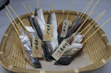 伊勢志摩で水揚げされた色々な魚を、手開きして天日干し。そして一本一本丁寧に串うちされた干物を卓上コンロでお客様自ら炙って召し上がれっていうお通しです。